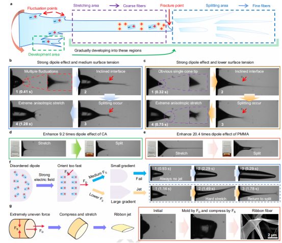 基于上述发现,提出了偶极定向电流体动力喷射模型,并在多种材料体系中得到验证。首先建立了严格的变量控制分析策略,通过观察射流时空分布规律,验证劈裂行为的波动点形成及其各向异性拉伸-撕裂演化规律,从而阐明了射流劈裂的偶极作用诱导机制,进一步拓展揭示了偶极作用诱导的射流无力、带状拉伸等广泛衍生行为,为可控微纳制造及生物基材料高精度按需成型提供了有力支撑。