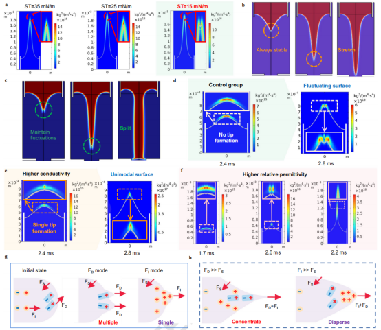 通过空间映射正交分析法,揭示工艺参数-射流行为-纤维形貌相互作用规律,结合仿真模型提出射流劈裂行为的界面波动诱导关键现象及其偶极作用机制。偶极力作用优先且分散,易在液面形成多尖端扰动和更强的应力集中,而自由电荷引起的静电力则倾向于广泛聚集形成单一尖端,这一发现打破了对射流分裂机制的传统认知。
