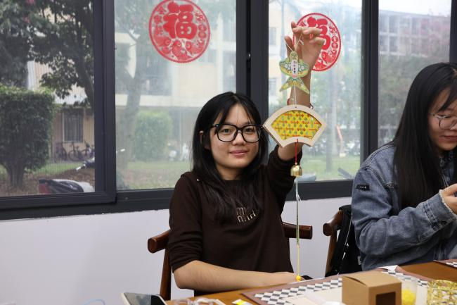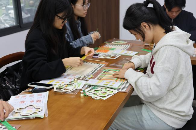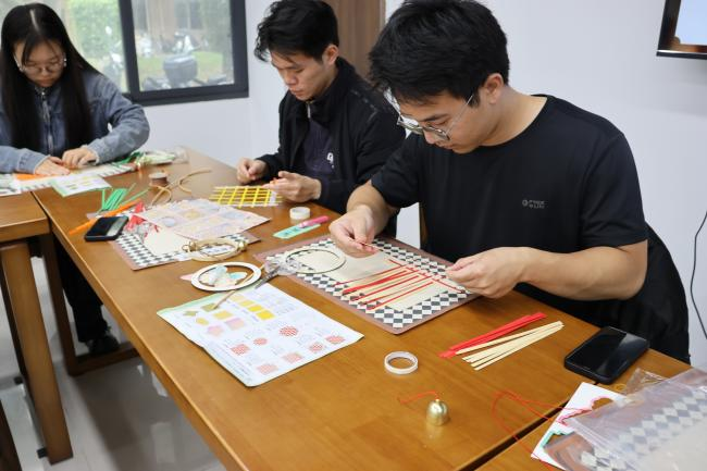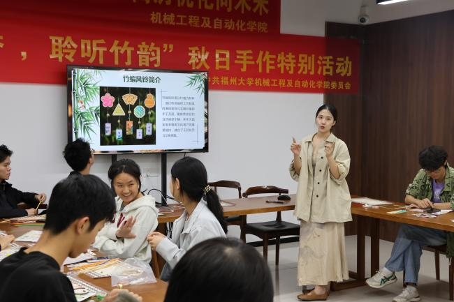 课堂中,陈恩婷老师首先将竹编风铃套装一一分发到同学手上,并详细介绍了非遗竹编风铃的历史和寓意:“竹篾为骨,清风作弦。竹编风铃以千年非遗技法编成,一挂一摇,便能把人瞬间带回山林深处的静谧。它不仅是国家级非物质文化遗产的‘活标本’,更把‘祈福纳吉、平安团圆’的美好寓意编织进每一道缝隙。风过铃响,是清廉自律的提醒,也是自然宁静的召唤;声声入耳,更是我们对美好生活的共同向往与情感寄托。”