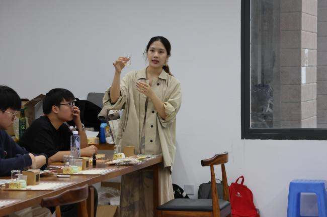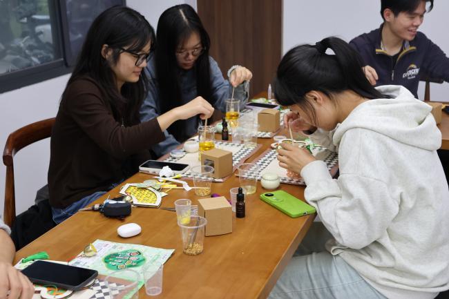 材料台上,桂花干、天然蜂蜡、植物精油依次排开,像一列等待检阅的“秋日方阵”。陈恩婷老师先带大家“识香”——辨桂花品种、讲精油萃取;再示范“调香”——加热、倒模,一整套动作行云流水。最后,他公开独家“最佳配比”,让同学们手握“黄金配方”,放心大胆地把秋天锁进小小盒中。