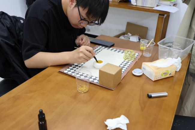 十分钟后,金色液体与桂花碎一同注入保存罐中,冷却三分钟即可完成一枚桂花香膏。十分钟光景,金色蜂蜡与星星般的桂花碎相遇,化作涓涓“秋泉”注入罐中;短短三分钟冷却,一枚“把桂花戴在手腕”的限定香膏便宣告诞生,指尖余温尚浓,福大的秋天已被封存。