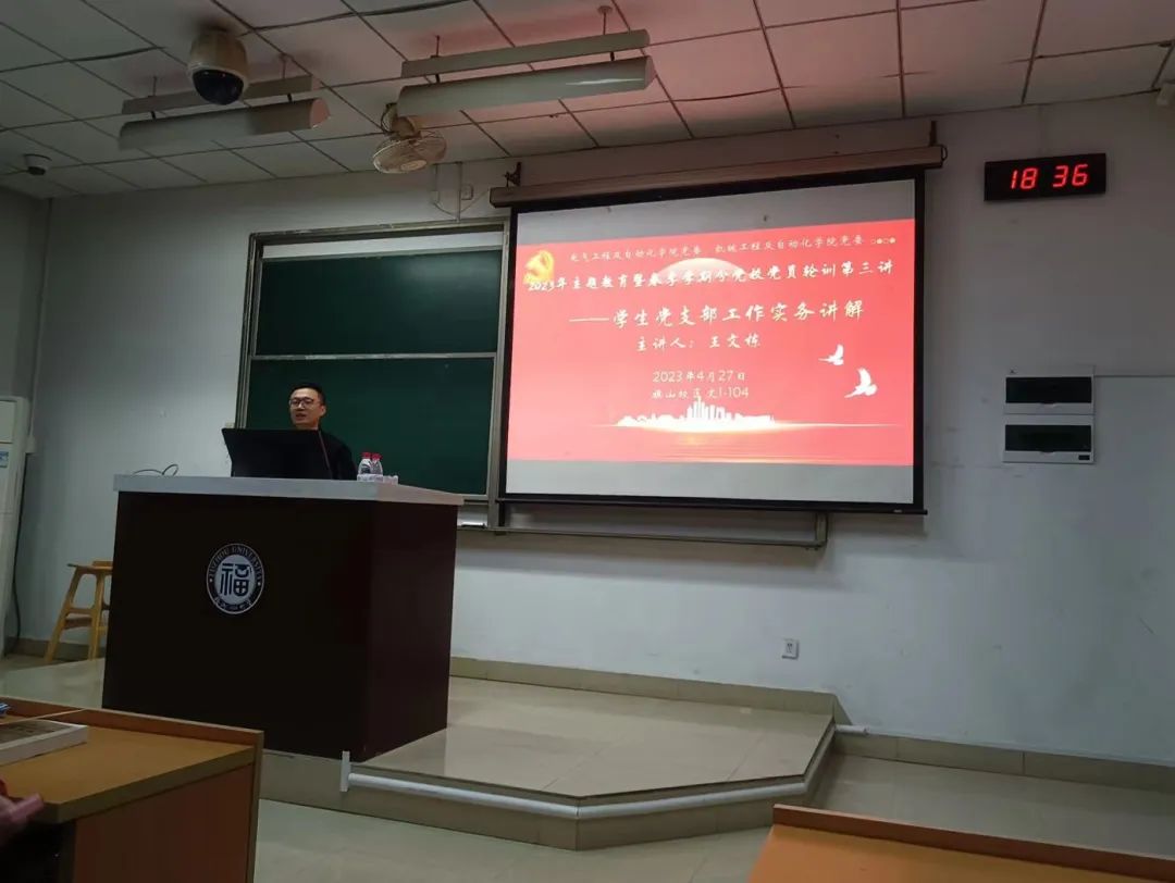党委于旗山校区文1-104教室联合举办2023年春季学期分党校党员轮训培训班第三讲——学生党支部工作实务讲解。本次讲座由材料学院王文栋老师主讲,电气学院、国产成人